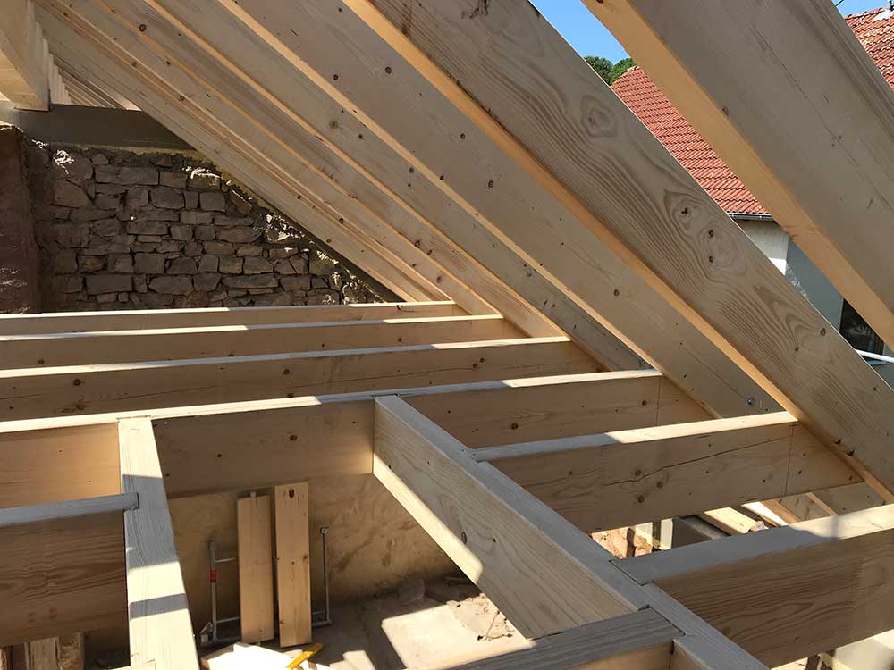 Der Dachstuhl ist die tragende Konstruktion eines Gebäudedaches und zweifellos die ursprünglichste Arbeit des Zimmererhandwerks. Das Dach ist dabei mehr als nur Schutzschirm und Deckel: Es prägt die Architektur und bietet vielfältige Wohn- und Nutzfunktionen. Jede Art von Dachtragwerk wird von uns individuell geplant, mit unserer Abbundanlage zugeschnitten und dann passgenau aufgerichtet.